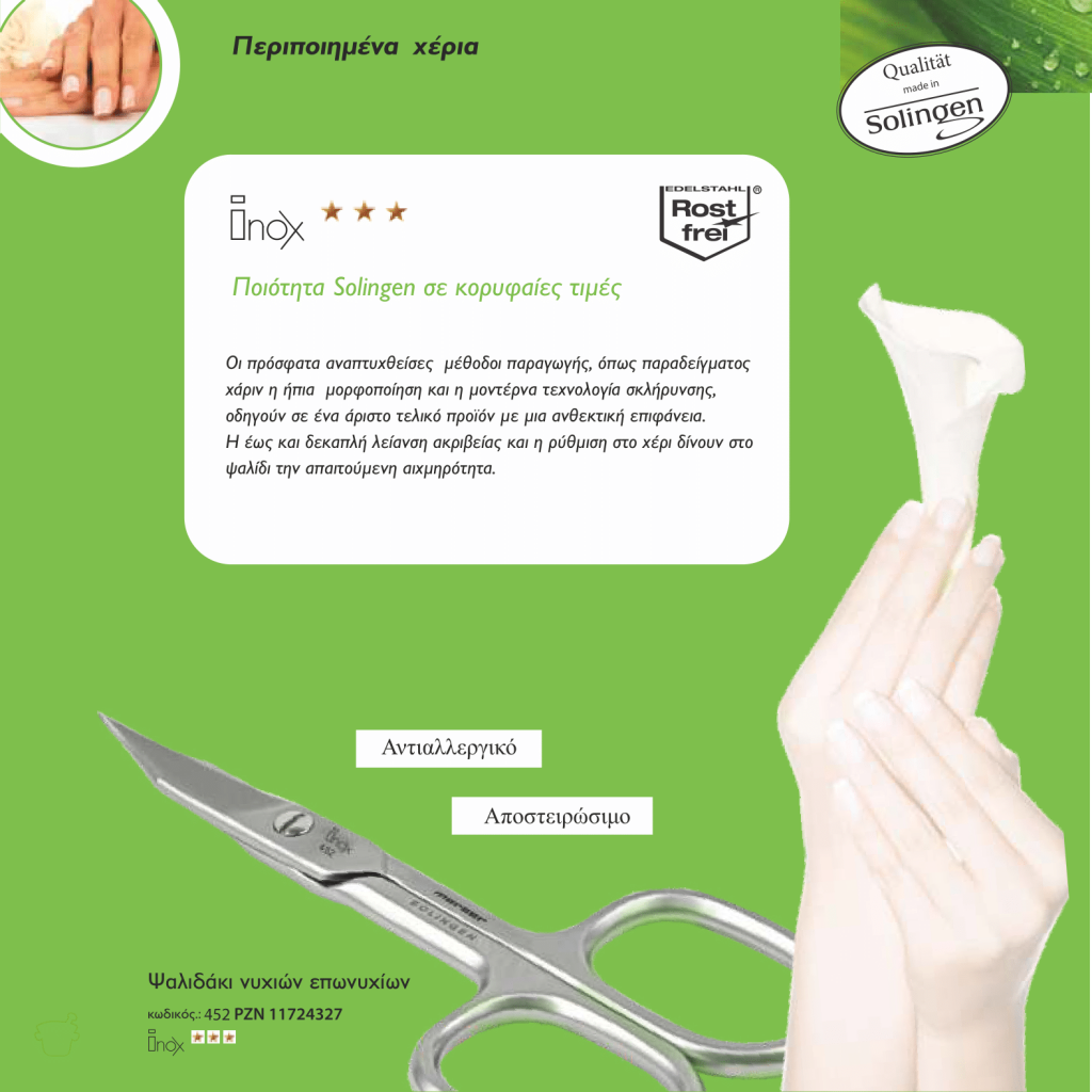 Τα ψαλιδάκια νυχιών και τα ψαλιδάκια για τα πετσάκια, οι τσιμπίδες, οι νυχοκόπτες, τα τσιμπιδάκια, οι λίμες και τα εργαλεία χειροκομίας (μανικιούρ) και ποδοκομίας (πεντικιούρ) κατασκευάζονται από κράματα σκληρυμένου χάλυβα.
